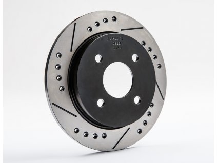 - One-piece brake discs with 6 grooves on the braking surface that act as a wiper, and drilled through holes with conical countersinking for the removal of hot gases; for the left and right side.